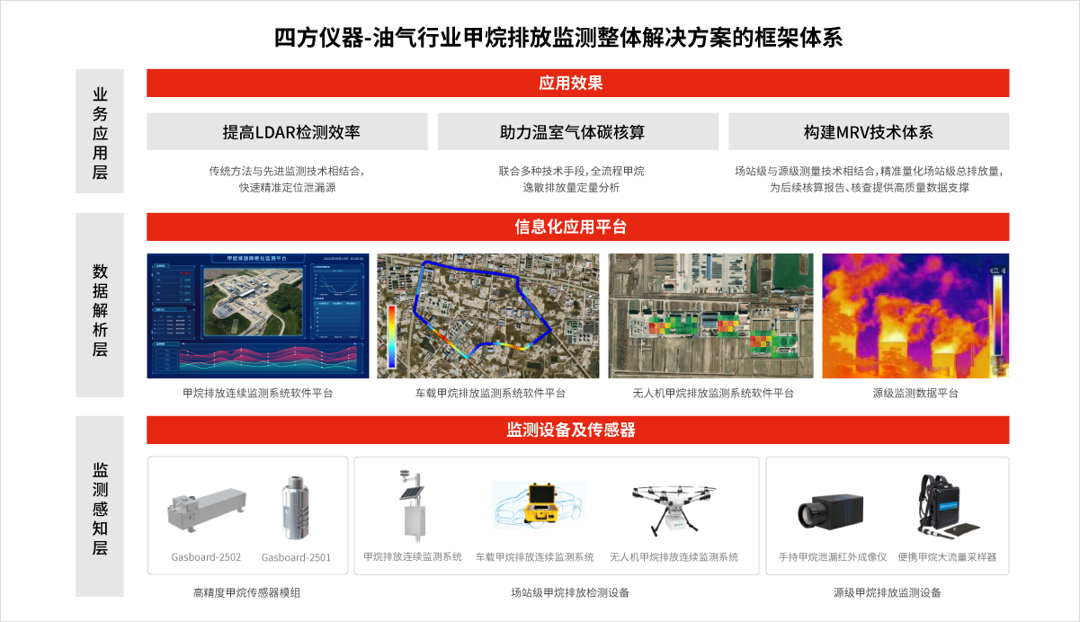 四方儀器油氣行業(yè)甲烷排放監(jiān)測解決方案以國家政策和行業(yè)標(biāo)準(zhǔn)為前提,結(jié)合場站級、源級甲烷排放監(jiān)測技術(shù),集成智能化數(shù)據(jù)分析平臺。該方案適用于油氣生產(chǎn)、開采、加工、儲存和運(yùn)輸?shù)雀鱾€環(huán)節(jié),能夠全方位、全流程地采集和測量甲烷排放濃度、氣象參數(shù)等關(guān)鍵數(shù)據(jù),實時計算甲烷排放率,能夠及時發(fā)現(xiàn)排放事件并量化排放級別。